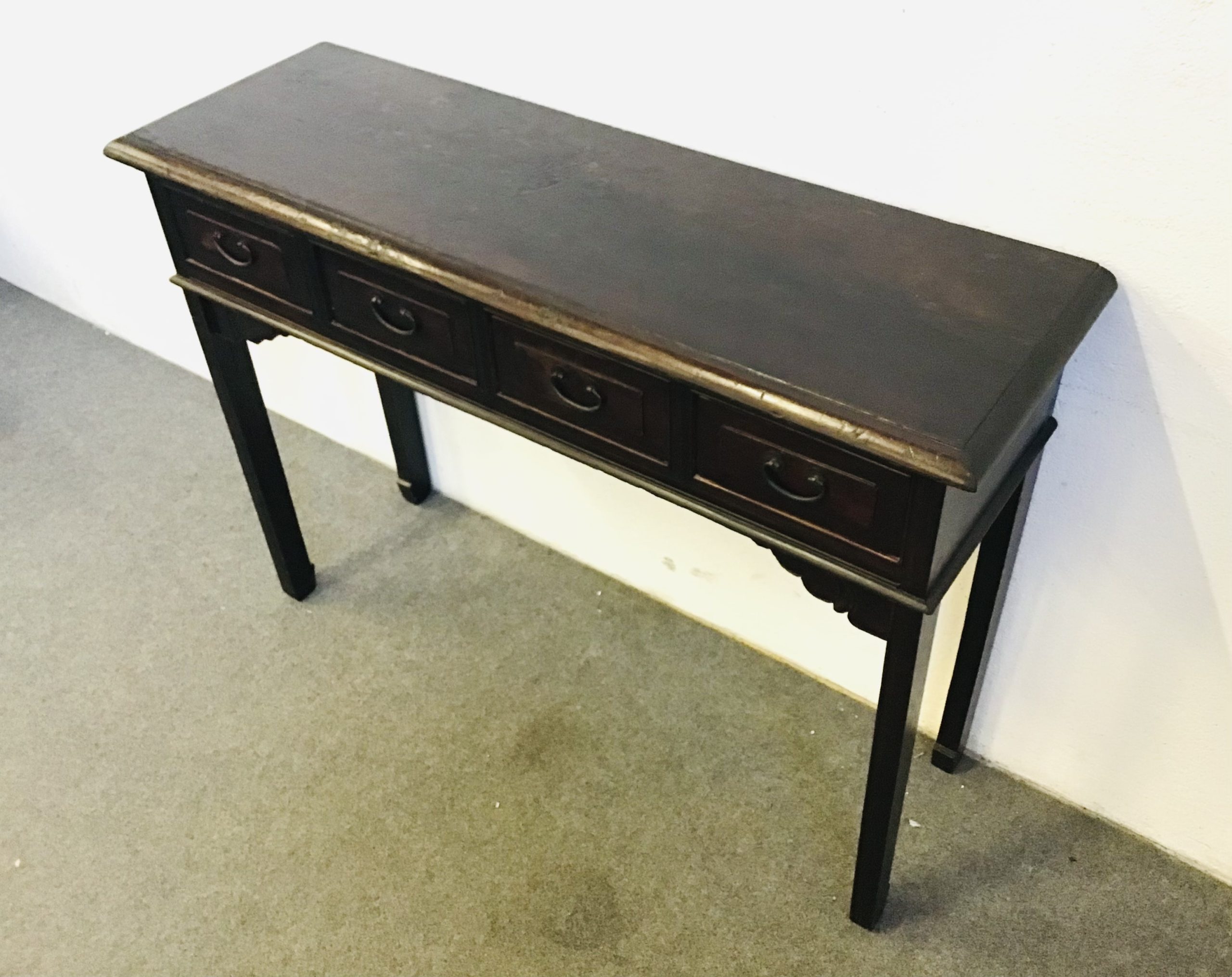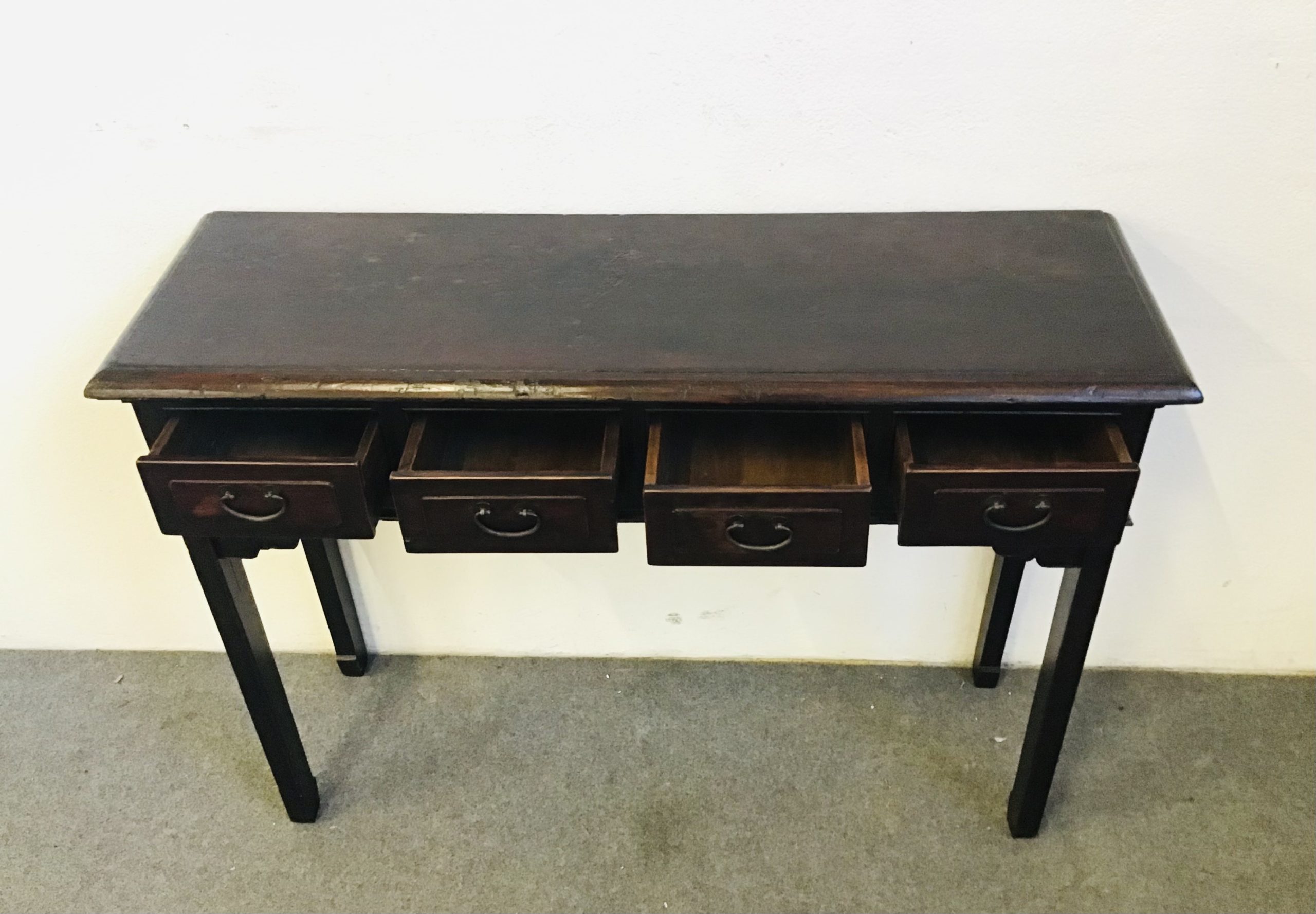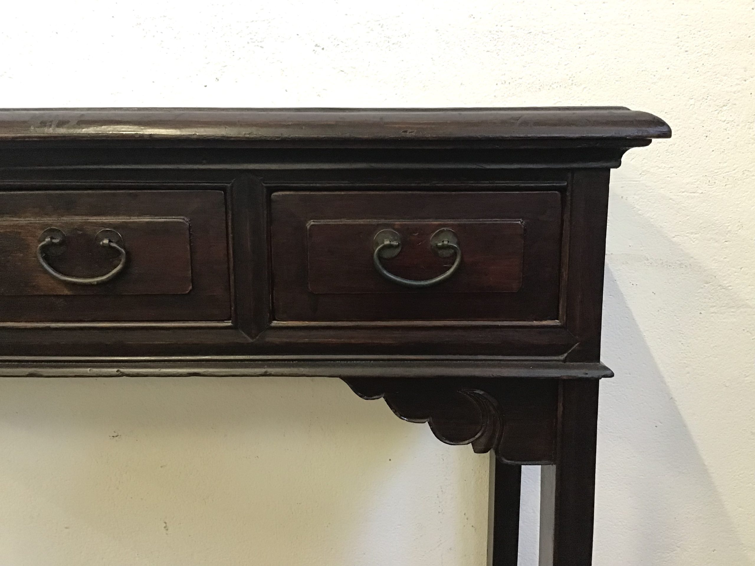 Consolle usabile anche come scrittoio,in legno di olmo con parti metalliche originali d’epoca.