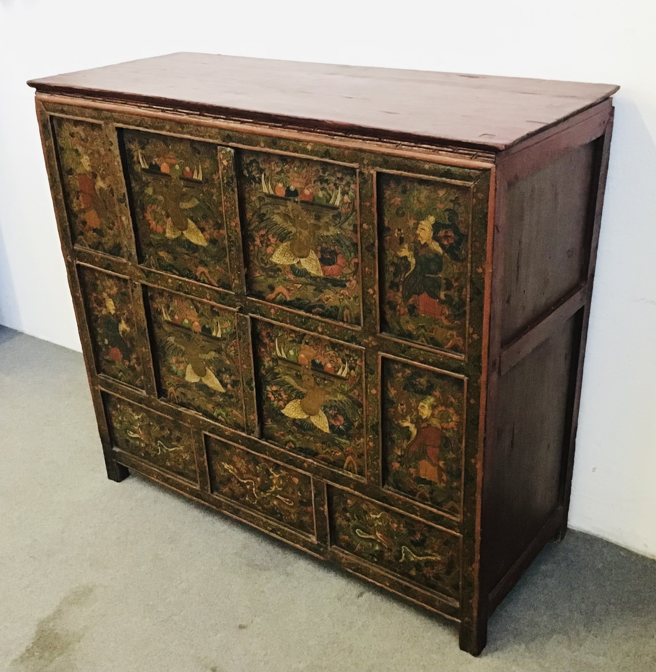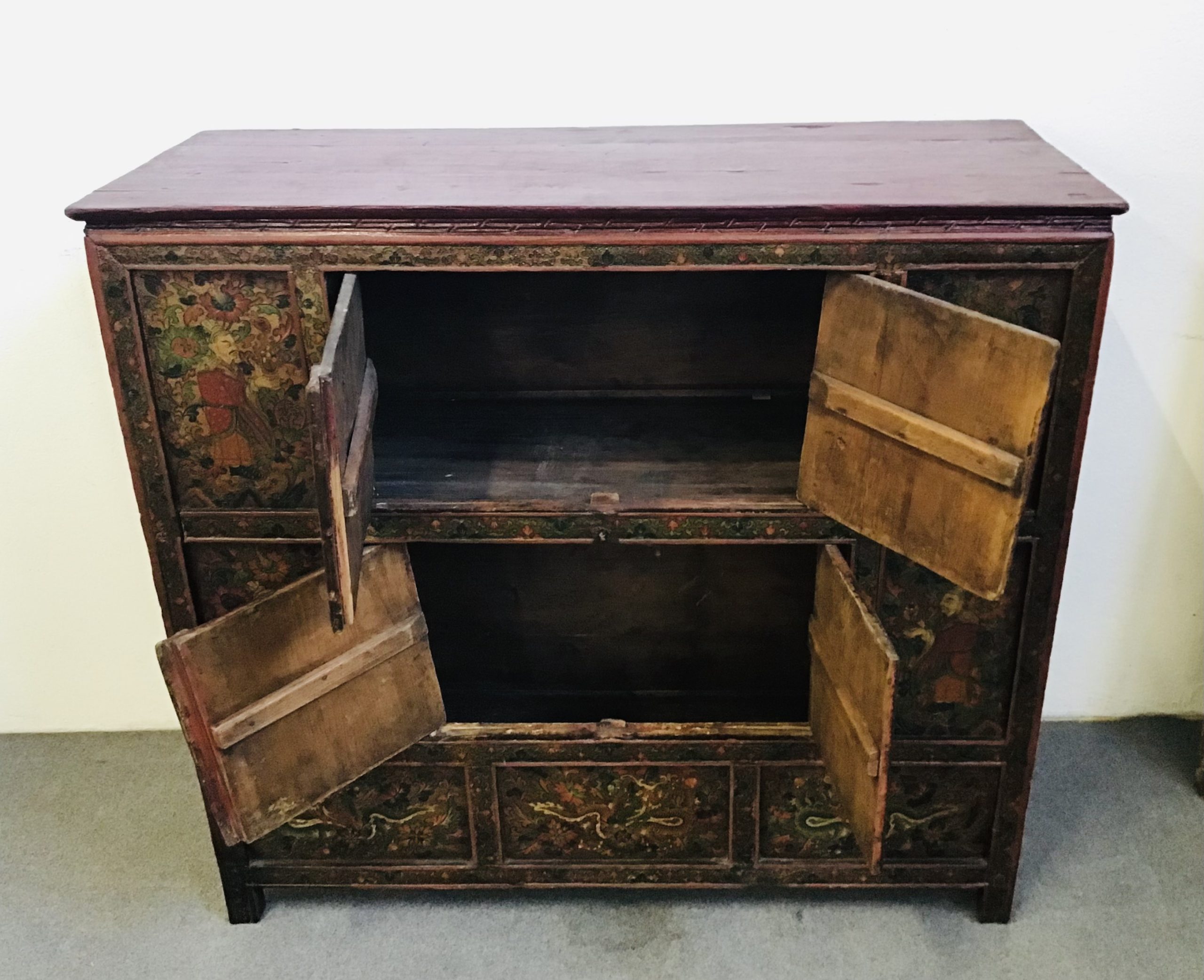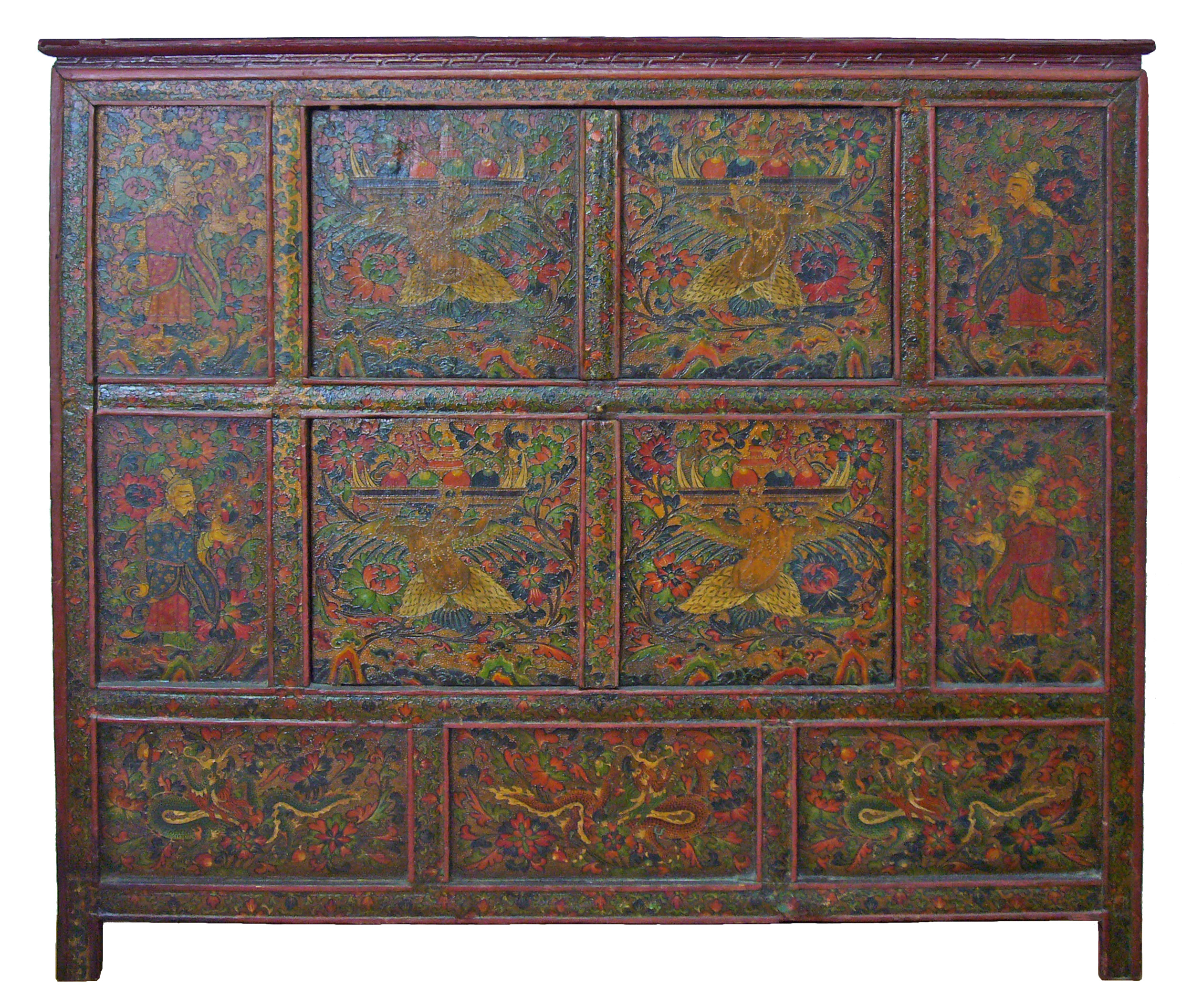 Nei tre pannelli centrali Garuda (uccello mitologico),quattro saggi ai lati e tre draghi nei pannelli inferiori.