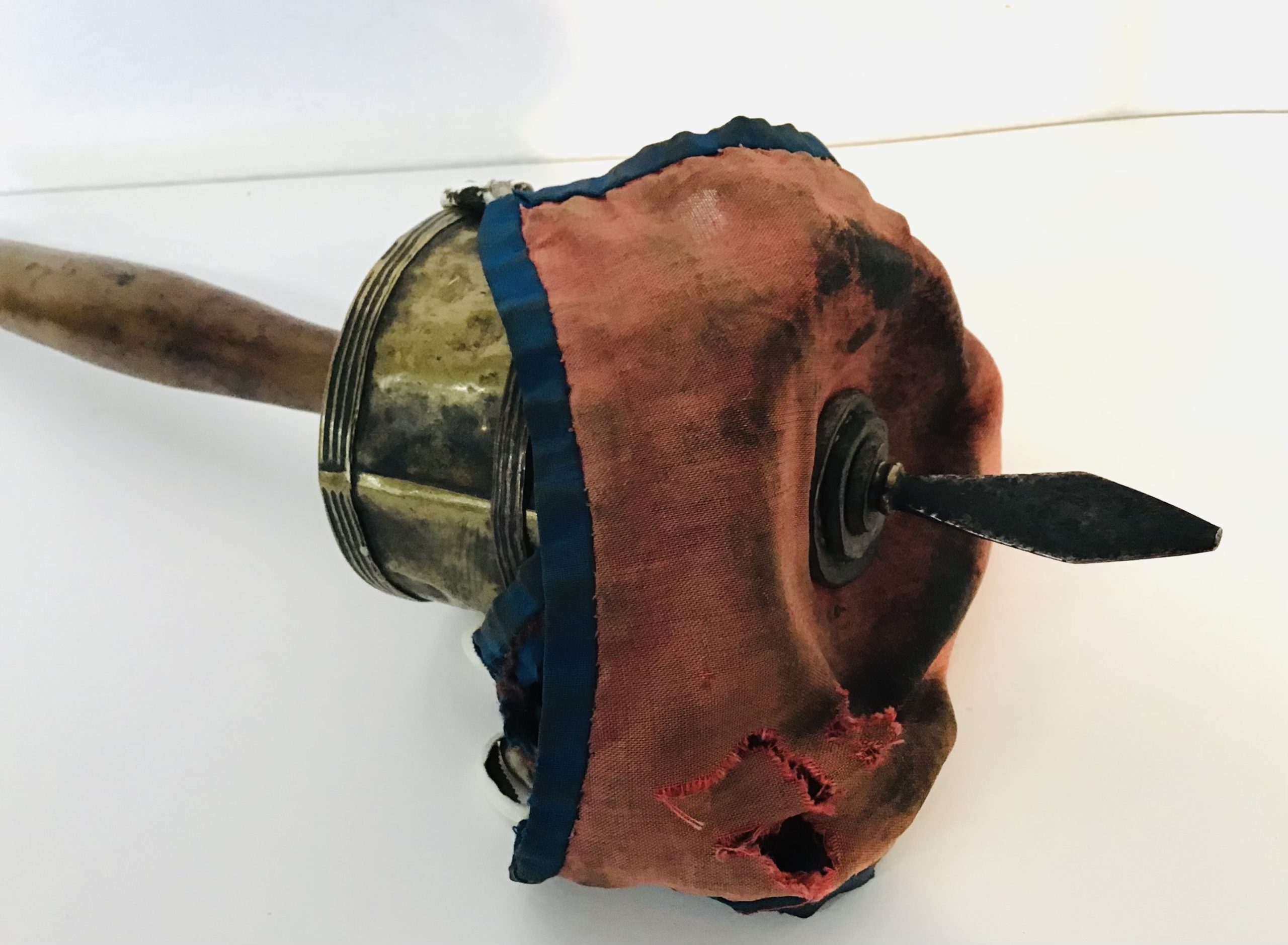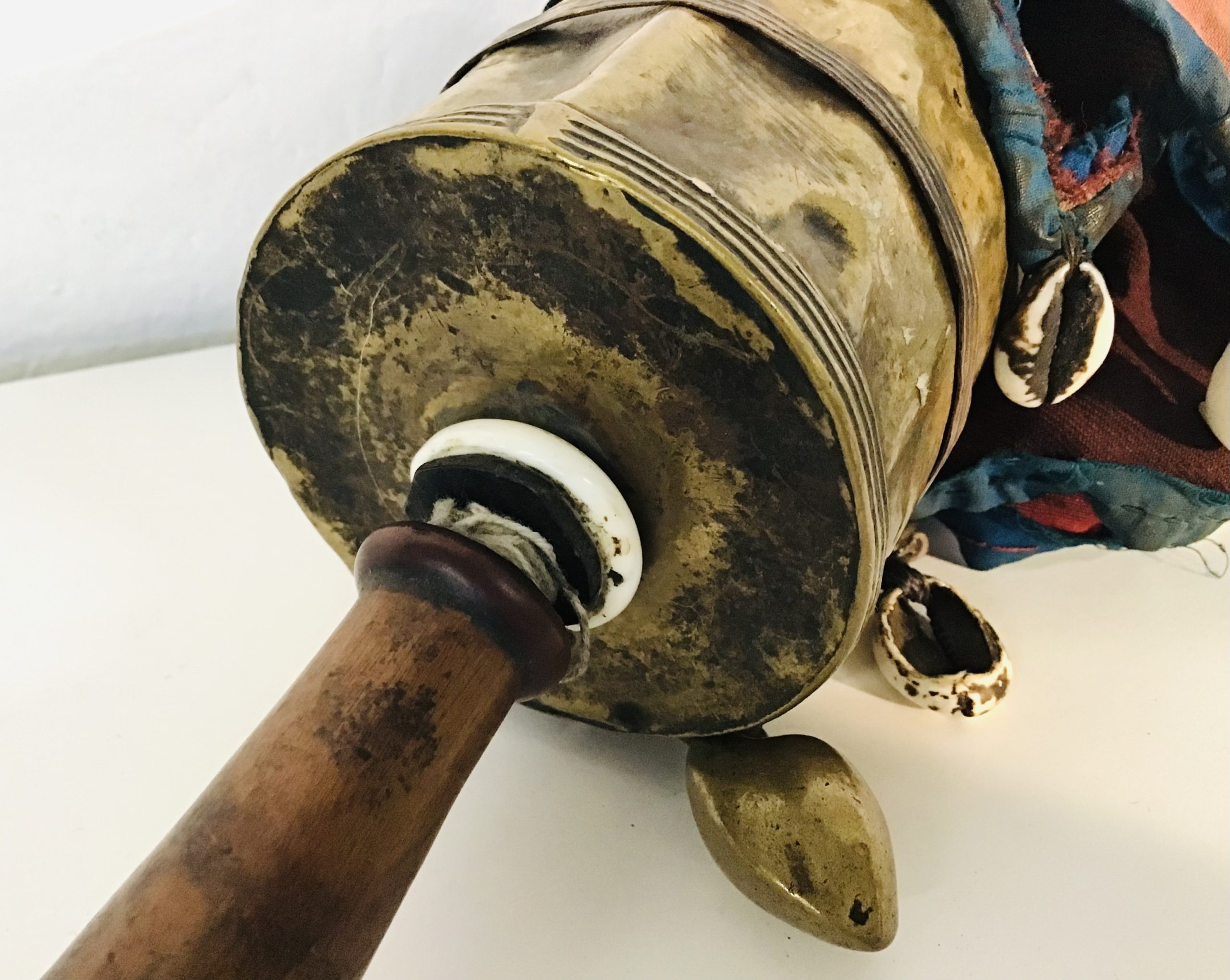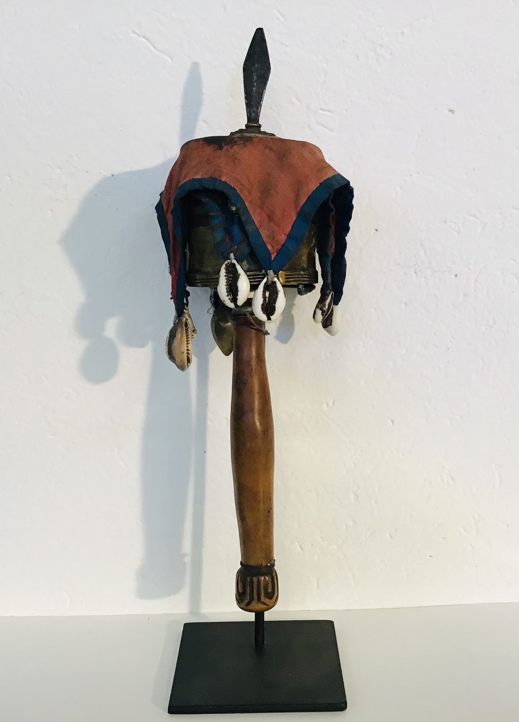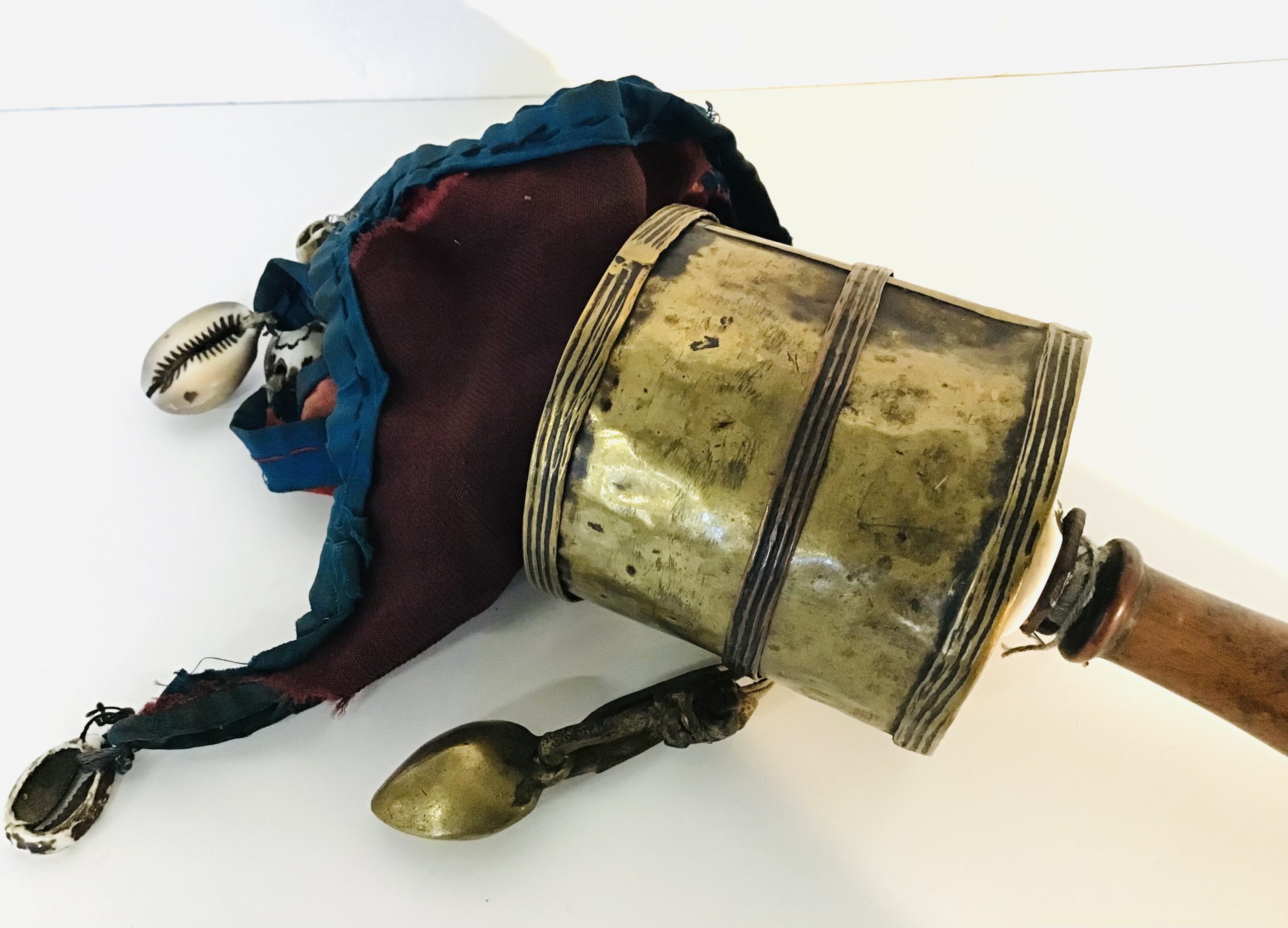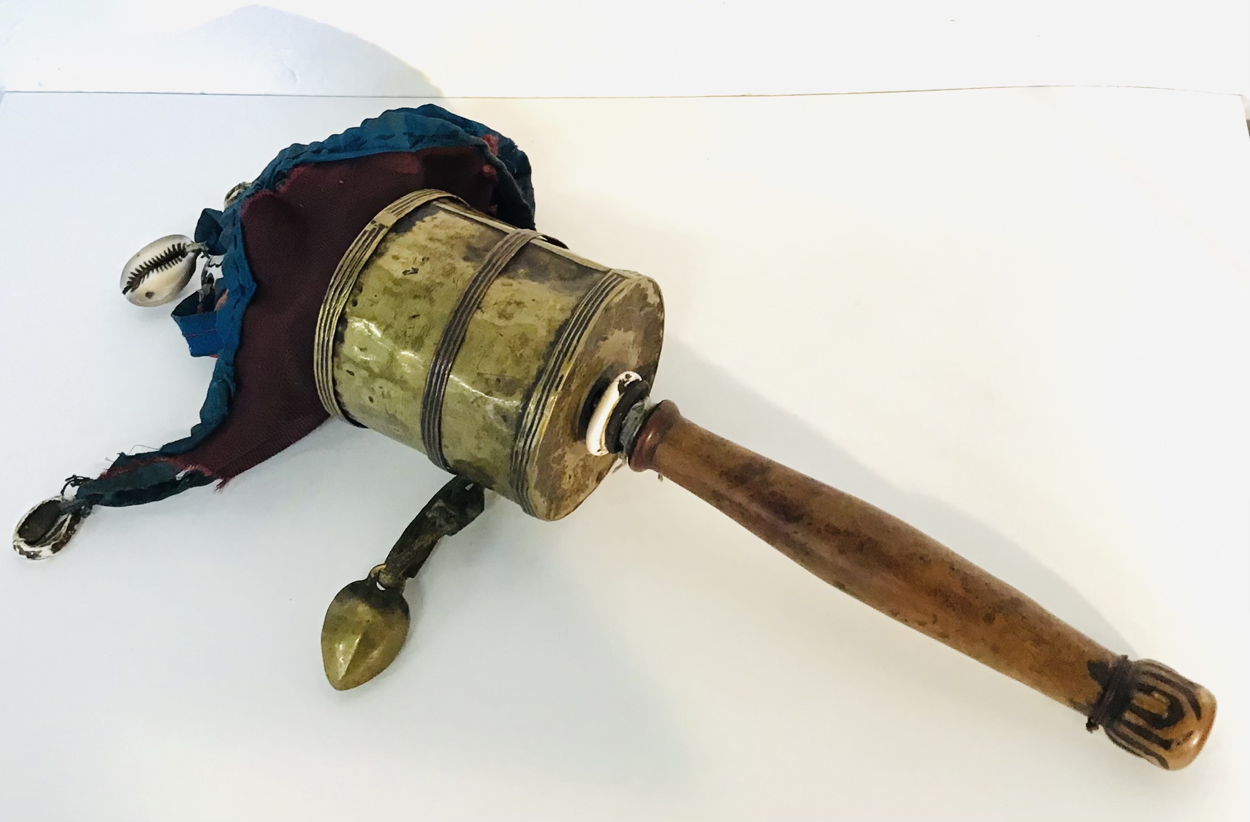 Mulinello da preghiera tibetano con corpo centrale ( contenente la pergamena con la preghiera ) in ottone,manico in legno e ombrello in cotone rosso e blu decorato con conchiglie ( cauri ).Puntale in ferro. oggetto visibilmente consumato dall’uso.