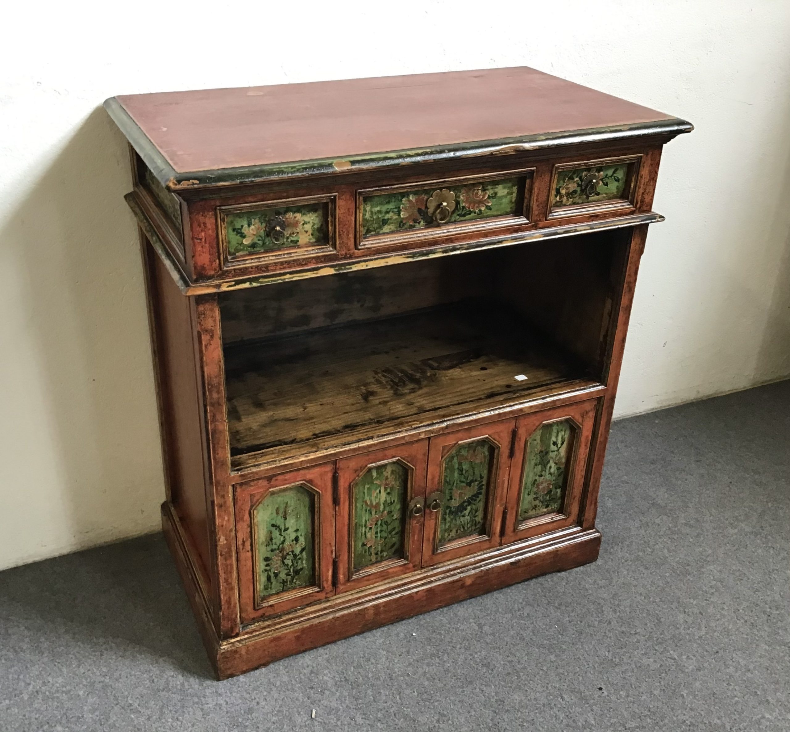 Piccola libreria con tre cassetti nella parte superiore e quattro antine in basso.